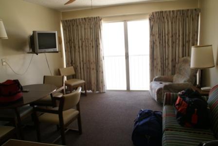 Das ist bestimmt auch in den 70ern gebaut und die Möbel + Einrichtung sind dementspechend. Aber sauber ist es und wir haben Wohn- u. Schlafzimmer incl. Küchenzeile. Und einen tollen Meerblick ! Da keine Hauptsaison ist bekommen wir die Suite für 76 $ (incl. Tax).