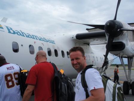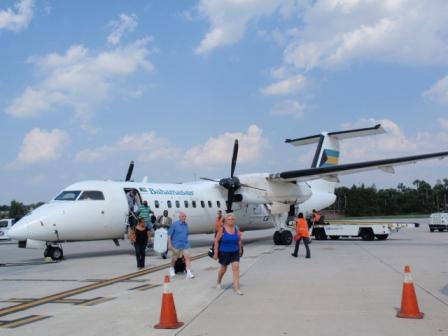 Beim Check-in am Airport Nassau von BAHAMAS AIR wollen die uns doch tatsächlich für das 2. Gepäckstück p.Pers. 20 $ abknöpfen... ich hatte die Flüge ja schon Ende März (nach den alten Bedingungen) gebucht und diese neue Regelung gilt erst ab Juli. Wer mich kennt weiß das ich hartnäckig sein kann. Die Lady beim Check-in guckte verwundert das ich die 40 $ nicht zahlen will und meinte "Das macht doch jeder". Ich aber nicht ! Somit rufen die Ladys beim zuständigen Manager, der sich mit so was auskennt, an und reichten mir den Hörer... wie gut das ich so gerne auf englisch telefoniere ;-))  Nach vielem hin und her habe ich es dann mit denen hinbekommen das wir nix zahlen müssen. Der Flieger ist eine Dash 8 Turbopropeller. Viele Leute passen hier nicht rein. Na, wir sind ja schon einiges gewöhnt aus unseren Thailand-Urlauben. Dem Schwarzen neben uns läuft richtig Angstschweiß auf der Stirn. Verstehe ich gar nicht. Der Flug ist völlig o.k. Zwar etwas laut, aber die 1 1/2 Stunden ...tzzz... und für 80 $ kommt man ebend nicht in der Luxusklasse von den Bahamas nach Orlando, oder ?