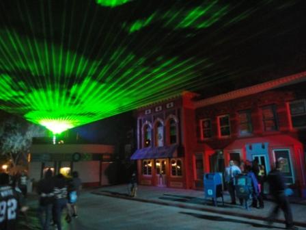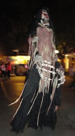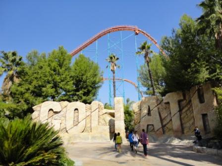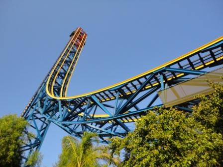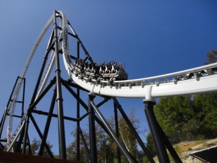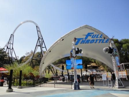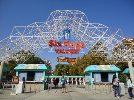 Sonntag, 13.10.13: SIX FLAGS Magic Mountain (Santa Clarita) Um 9:00 Uhr sitzen wir ausgeschlafen im Frühstücksraum und hauen uns den ganzen amerikanischen Schweinkram rein, der den Cholesterinspiegel in den roten Bereich steigen lässt. Aber wir brauchen eine gute Grundlagen für einen langen Tag bei Six Flags ;-)) Wir freuen uns schon auf die neue Achterbahn "Big Throttle", die erst ein paar Monate offen hat. Sie hat den höchsten Looping der Welt. Der Park ist einfach ein Muss für alle Coasterfans. Der Parkplatz kostet jetzt schon 20 $ !!! Wie wir das 1. Mal 1995 hier waren, da waren es gerade mal 7 $. Um 10:30 Uhr stehen wir am Eingang und strömen mit hunderten weiteren Adrealinjunkies in den Park. Dort verläuft es sich aber, denn er ist mega groß. Es gibt eine Menge Achterbahnen hier. Die Tickets hatten wir online gebucht mit einem Halloween-Fast-Line-Spezial für den Abend wo wir keine langen Wartezeiten vor den Fright-Attraktionen haben. Der Preis der Karte ist mit 80 $ angemessen, für das was man hier im Park geboten bekommt. Wer mehr über den Park wissen will kann sich auf www.worldofcoaster.de gute Bilder anschauen. Diese Seite gehört Olli, einen Freund von uns. Deshalb hier auch nur ein paar ganz spontan Bilder vom Tag:
