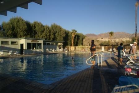 und erreichen dann endlich um 16:45 Uhr den Ort "Furnance Creek". Wir düsen gleich zu Jeepvermietung um abzuklären ob wir den für Morgen reservierten Jeep überhaupt nutzen können. Denn es ist seit dem 01.10. ja der SHUTDOWN (alle Nationalparks und Museen sind geschlossen). Da der Highway 190 aber eine wichtige Durchgangsstraße nach Las Vegas ist, durften sie diesen Park aber nicht ganz schließen. Glück für uns, denn die Übernachtung dort war schon vor Monaten bei den NECKERMÄNNERN gebucht und bezahlt. Auch das was wir Morgen vorhaben stand schon einige Jahre auf unserer to do-Liste, was wir noch gerne machen würden. Der Inhaber der Jeepvermietung ist super nett und kennt das DV wie seine Westentasche. Er erklärt das wir Morgen, trotz Government Shutdown, ohne Strafe zur Racetrack Playa kommen können, allerdings mit einem "kleinen" Umweg den er uns Morgen früh genau erklären wird. In dem Ort Furnance Creek gibt es nur dieses eine Motel (Furnace Creek Ranch) und ein Hotel das "Inn" (für die mit der goldenen Kreditkarte ;-)) Der Benzinpreis ist hier der Hammer. Wer also dran denkt - vorher noch mal tanken !!! Wir sind erleichtert das der Trip nicht in Wasser fallen wird, checken nun im Motel ein und genießen den Rest des Abends im warmen Quellwasserpool. Es sind nicht viele Leute hier, viele die kostenlos stornieren konnten, haben es auch getan. Die Motelanlage mit bestimmt 200 Zimmern ist sonst immer lange im Voraus ausgebucht.