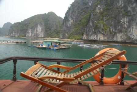 Und teilt sich unsere Gruppe. Einige haben einen weiteren Tag auf See gebucht, einige müssen wir der zurück nach Halong Bay und wir steigen auf ein kleineres Boot um und werden nach Cat Ba Island gebracht. Auch hier haben wir die Stunde Fahrt bis zur Insel die Möglichkeit uns an Deck in Liegestühlen zu sonnen. Unser Guide Nam fährt mit uns.