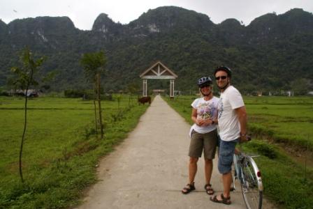 Auf der Insel angekommen mieten wir uns Fahrräder. Das sind wieder dieselben Gurken wie in Hoi An., nur diesmal in modernblue... hi,hi. Nach 2 Minuten muss ich umdrehen weil meine Pedale fast abfällt. Wir tauschen es und los geht es. Der Fahrradweg führt ohne viel Steigung ca. 6-7 km durch den Süden der Insel. Und es ist mal wieder Helmpflicht...