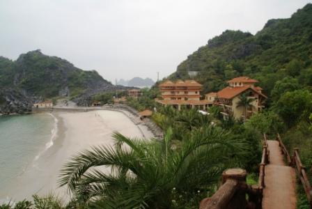 Wir wollen uns eigentlich eine Massage gönnen, finden aber keine ;-(( Und auch sonst ist der Ort wenig einladend und mehr auf den Vietnamesischen Tourismus gepimpt. Zum Glück haben wir kein Hotel am Hafen gebucht, denn heute Abend steigt ein Festival zum Saisonstart. Da würde uns eine schlaflose Nacht bescheren. Die Musik ist ja sehr gewöhnungsbedürftig. Wir finden dann noch einen schönen Rundweg um die Felsen, der uns auch an einem anderen 4 *- Hotel vorbeiführt. Das ist aber nicht so schön wie unserers und sieht recht abgewohnt aus. Abendessen gibt es diesmal in unserem Hotel. Das ist im Paketpreis der Bootstour enthalten. Wir sind darüber echt froh, denn die Auswahl an Restaurants ist mau. Wir können wählen zwischen 2 Menüs. Das Essen ist sehr lecker. Danach buchen wir uns im Hotel eine 1,5-stündige Massage, weil hier so gar nichts los ist. Der Preis ist mit 15 $ noch human für Hotelpreise. Es gibt hier auch einen Jacuzzi. Den Abend verbringe ich dann damit mal wieder ein paar Zeilen hier zu schreiben.