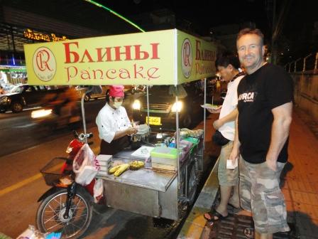 Banana-Pancake rein... lecker, lecker. Für die gegrillten Hühnerfüße ist